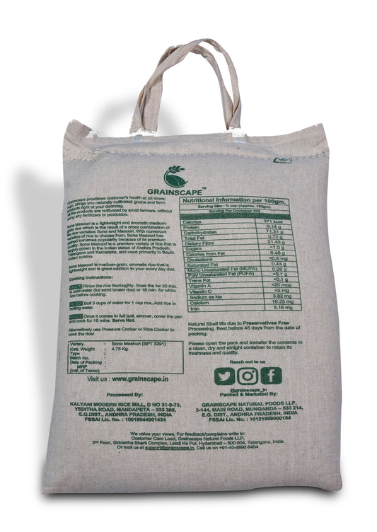 Grainscape Premium Sona Masoori Rice 4.75 kg. Bag - Naturally Harvested